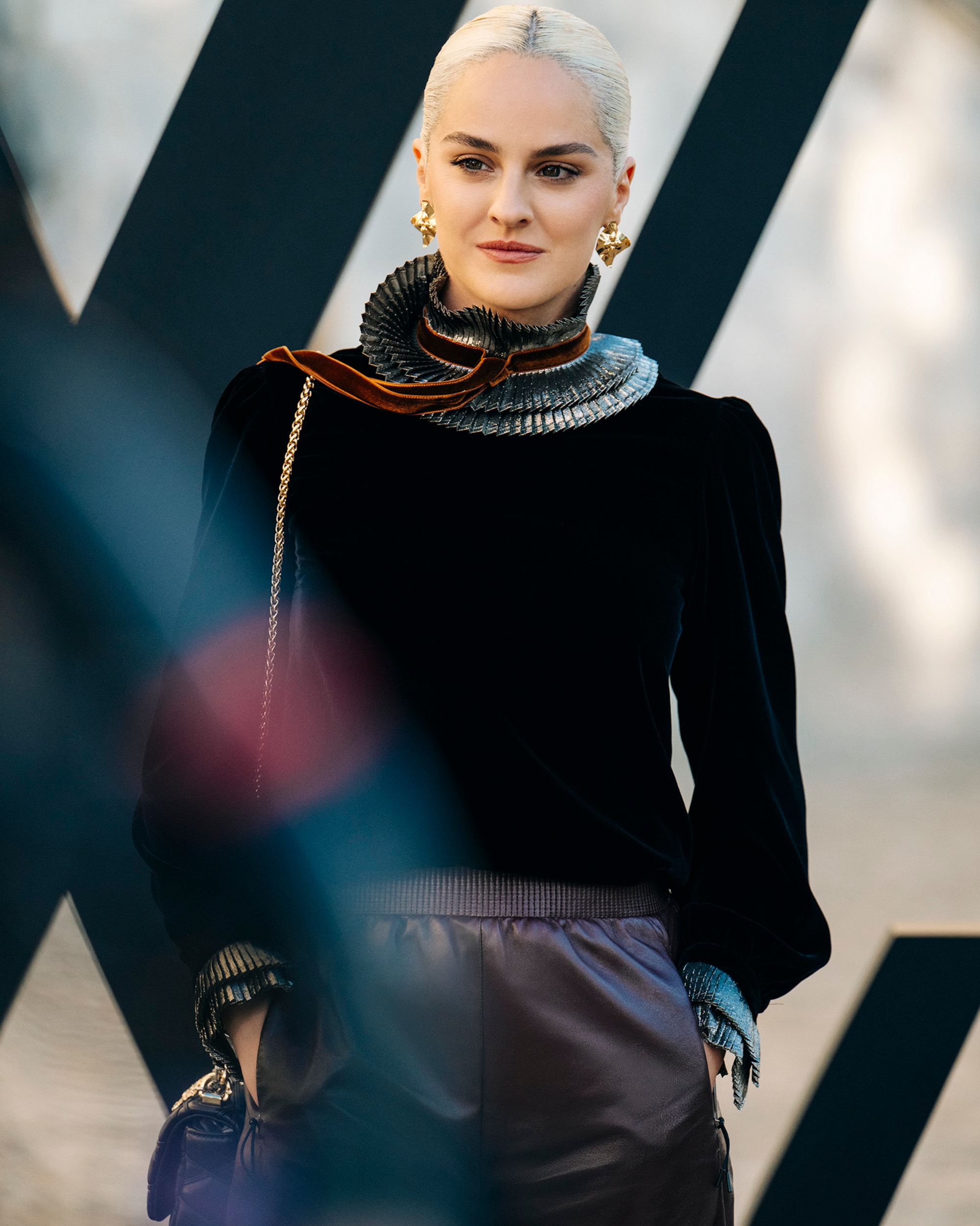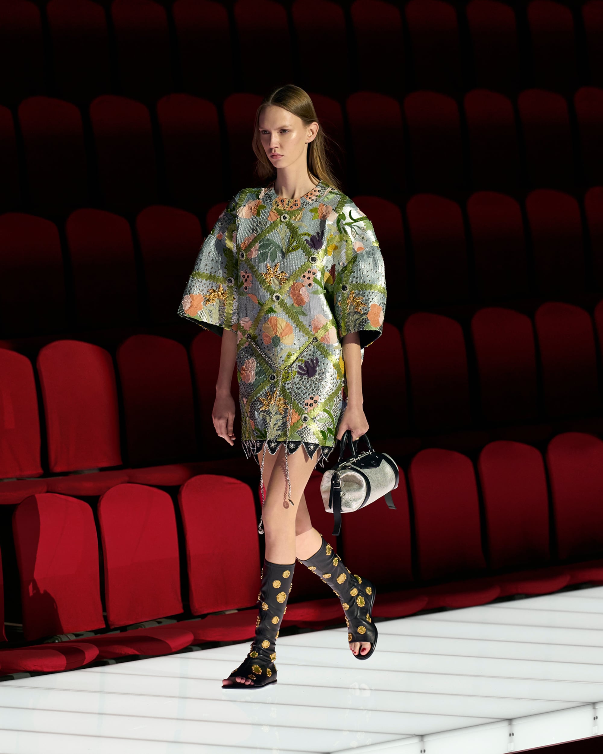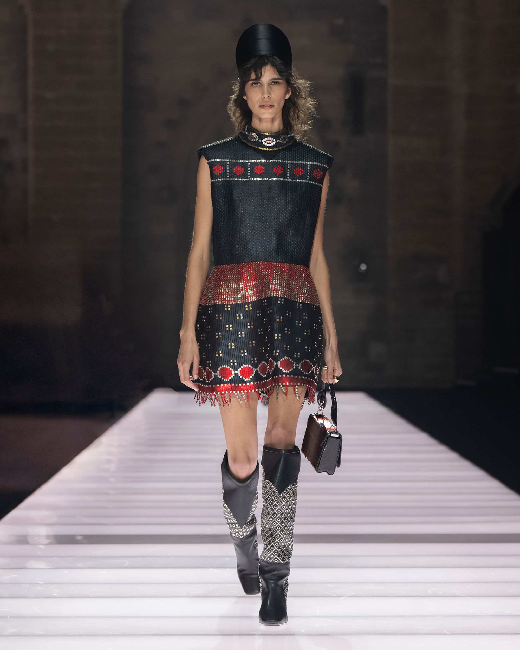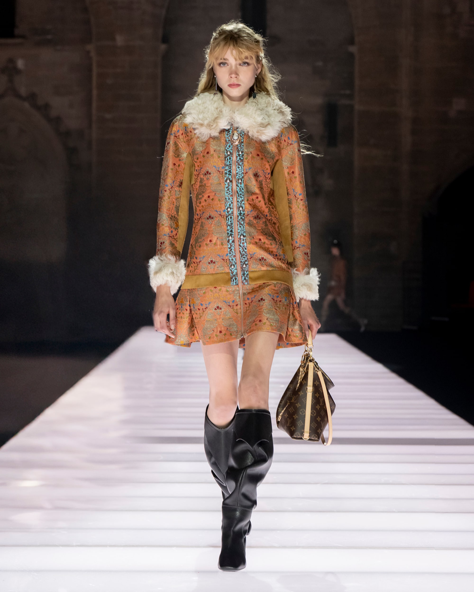 Epitomising a dramatic clash of eras, the splendour of the Middle Ages collides with glam rock extravagance in Nicolas Ghesquière’s homage to the performing arts — underscored by the distinct allure of Louis Vuitton’s leading women.