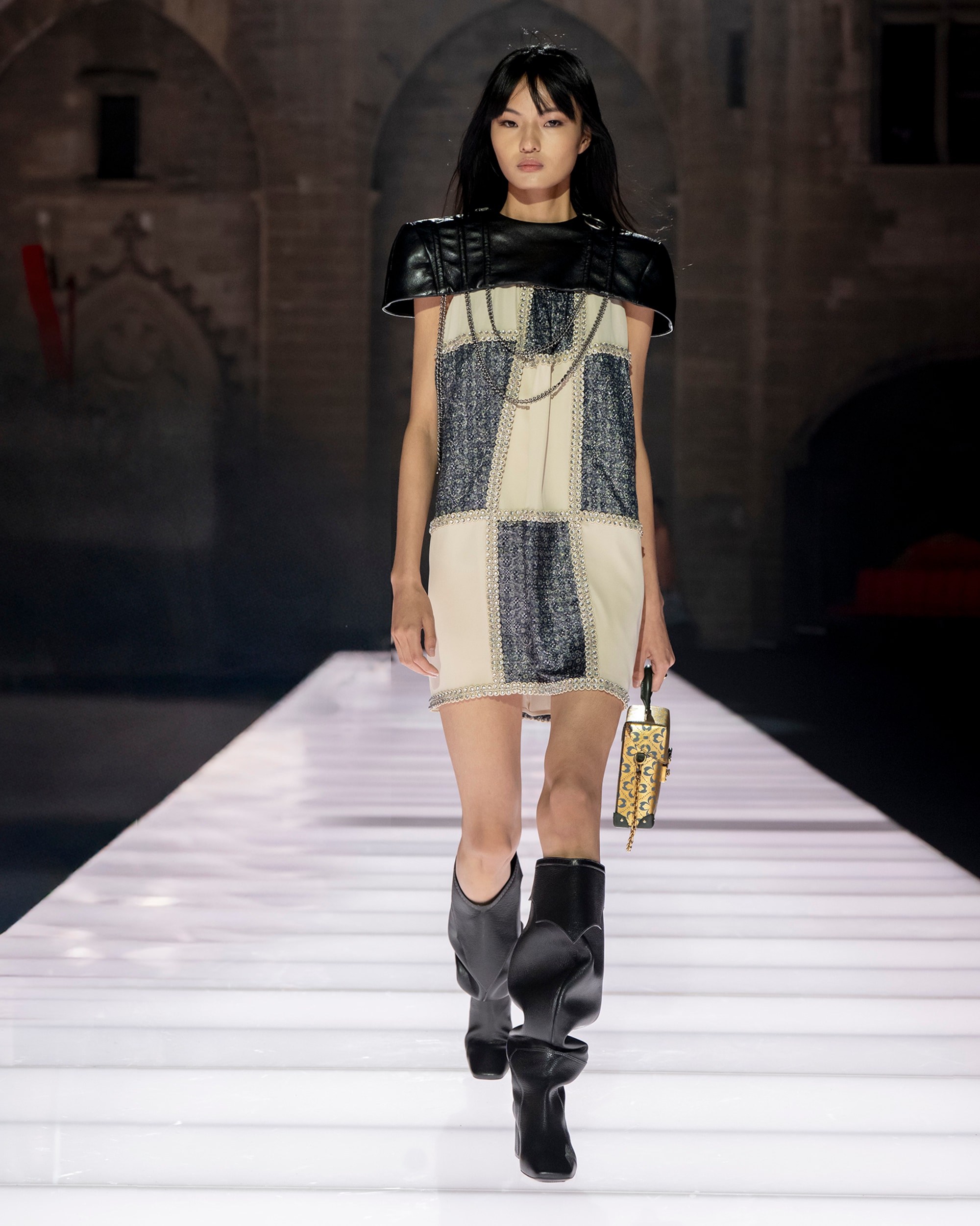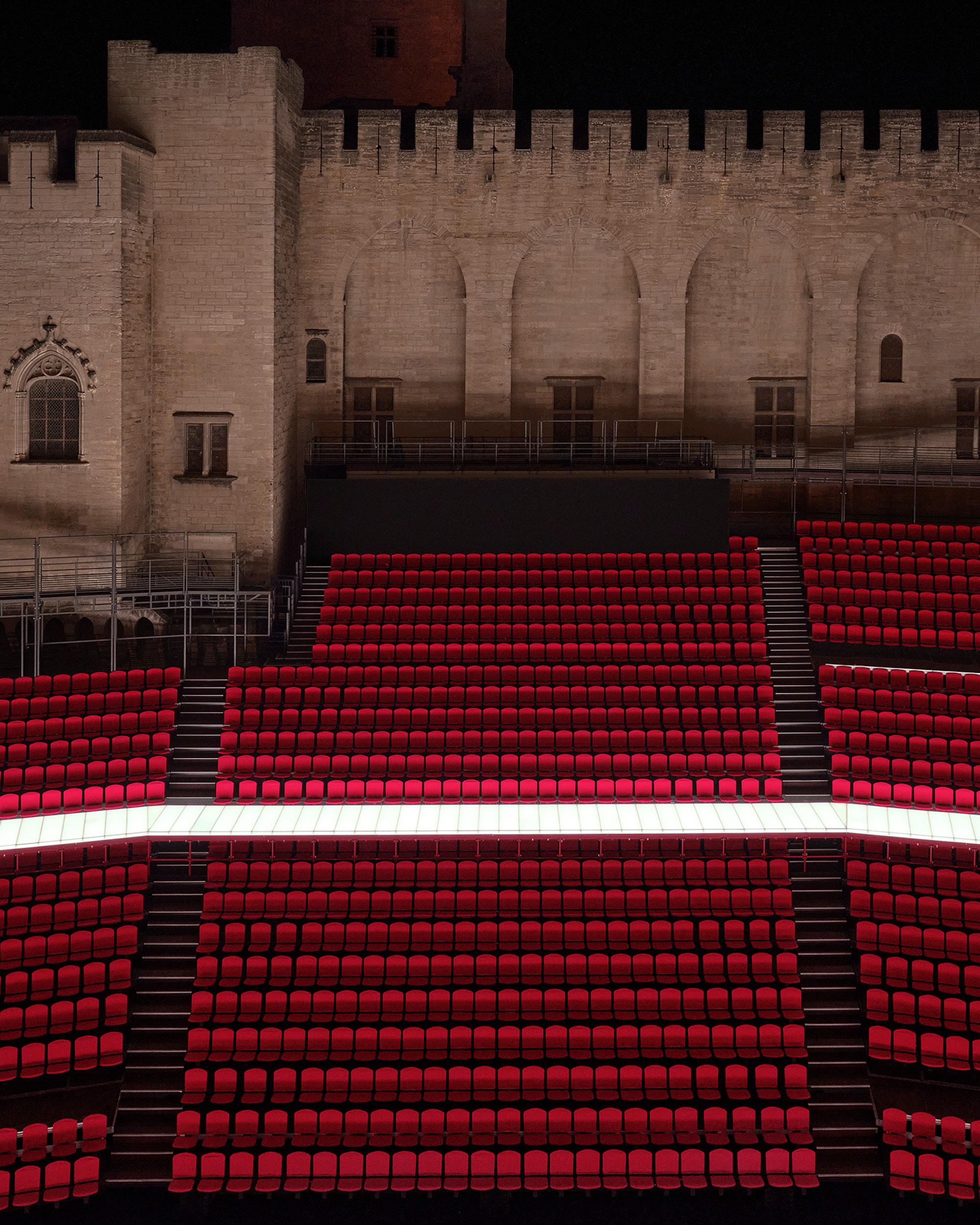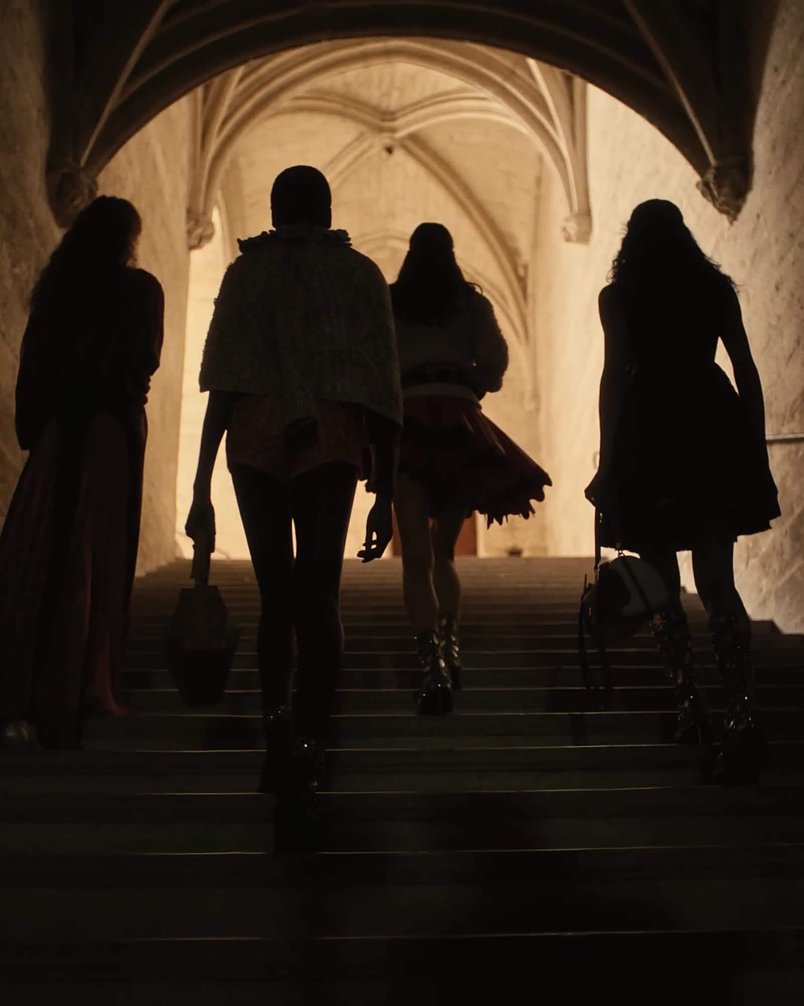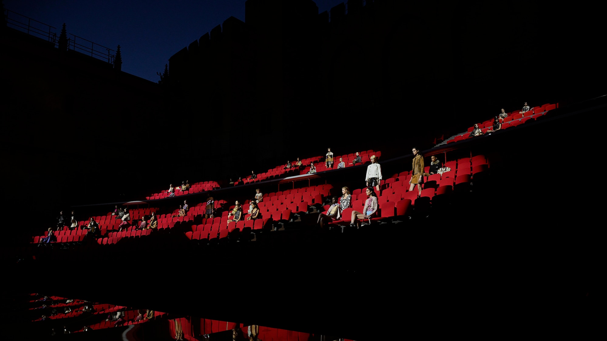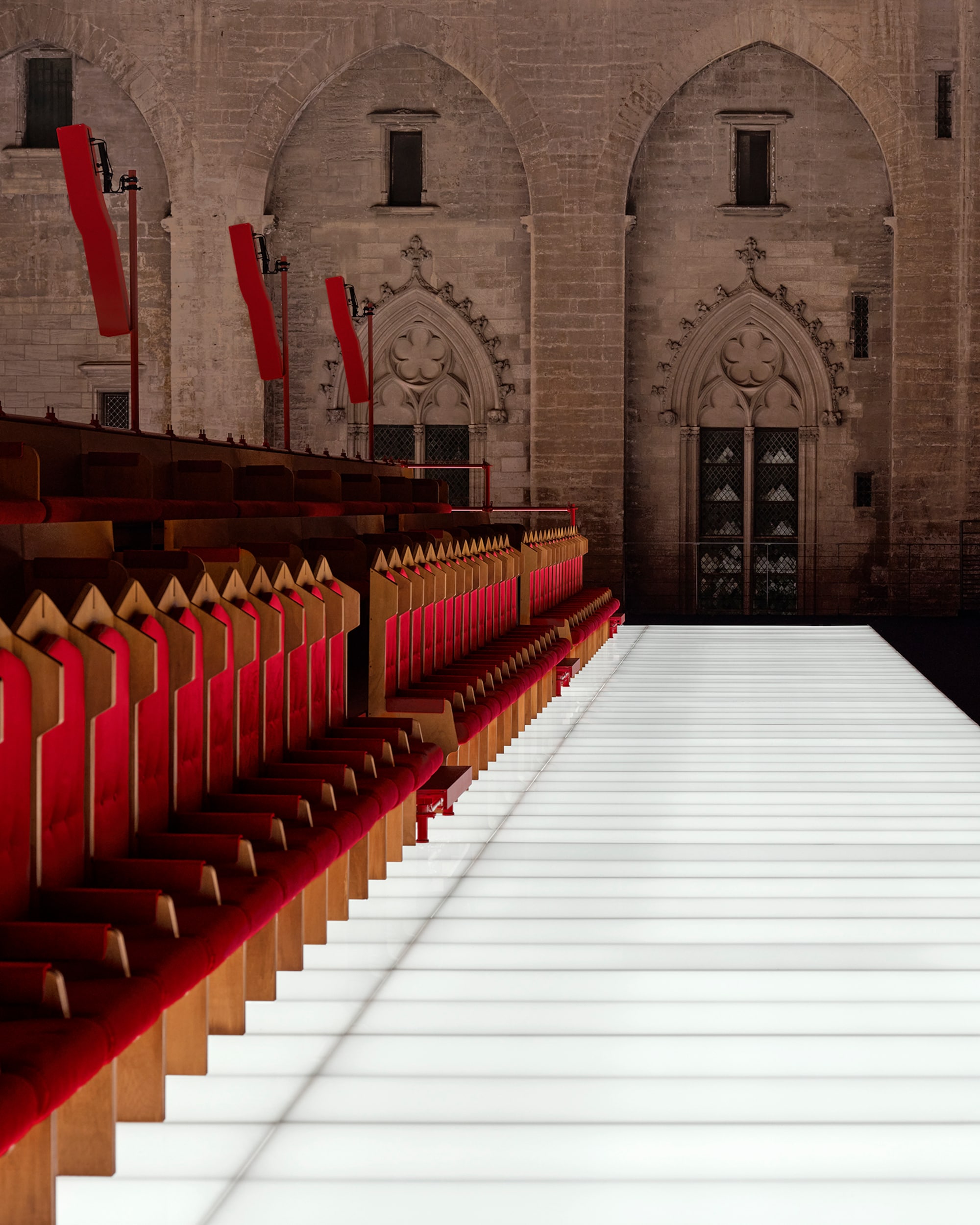 A theater of great history, the Palais des Papes in Avignon lends its medieval walls to Nicolas Ghesquière's reflection on the performative aspect of fashion and the emotional power it conveys.