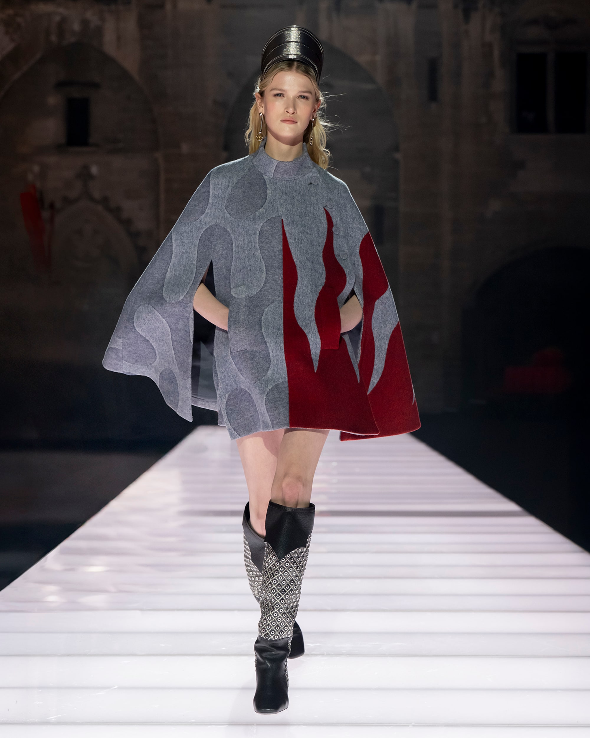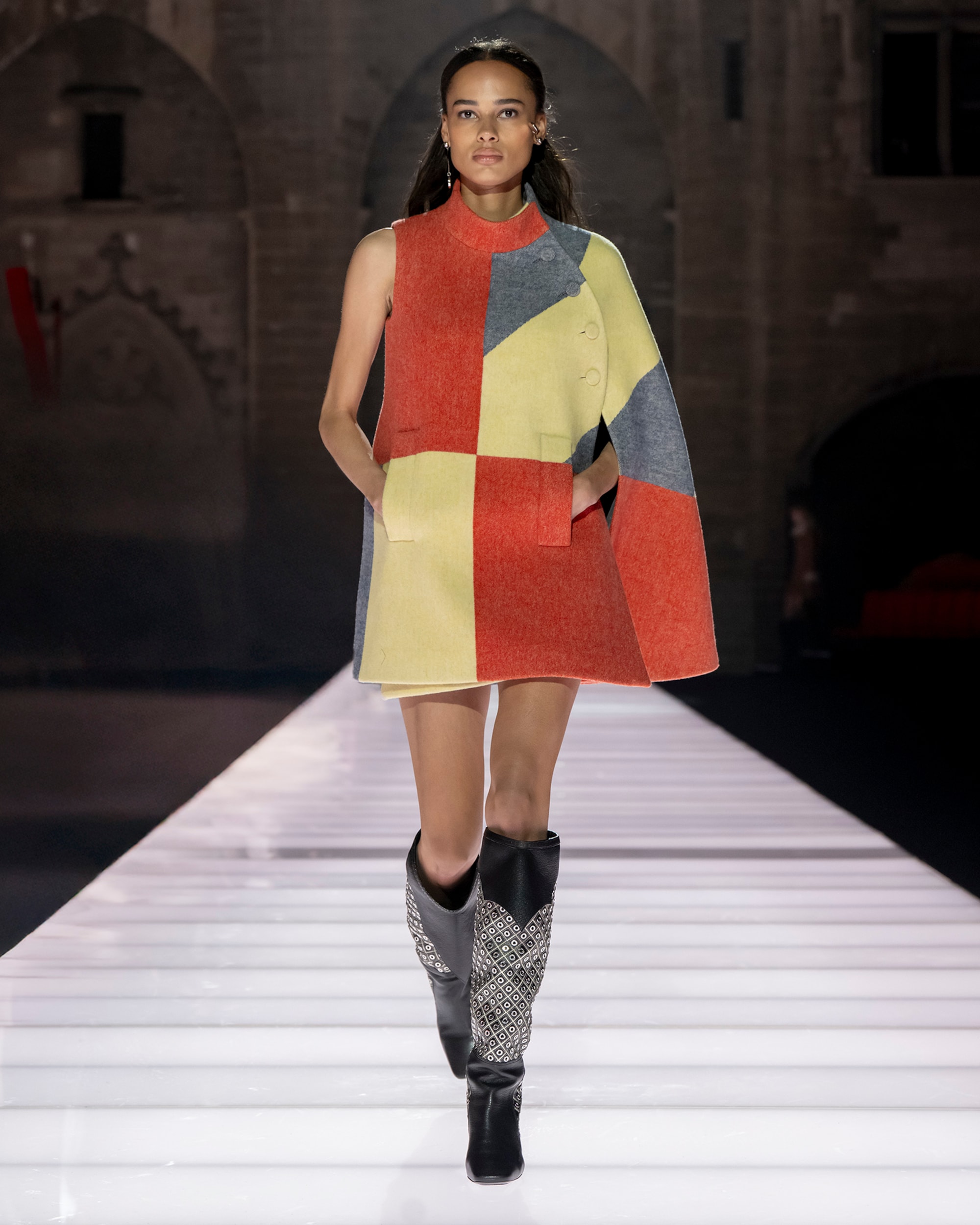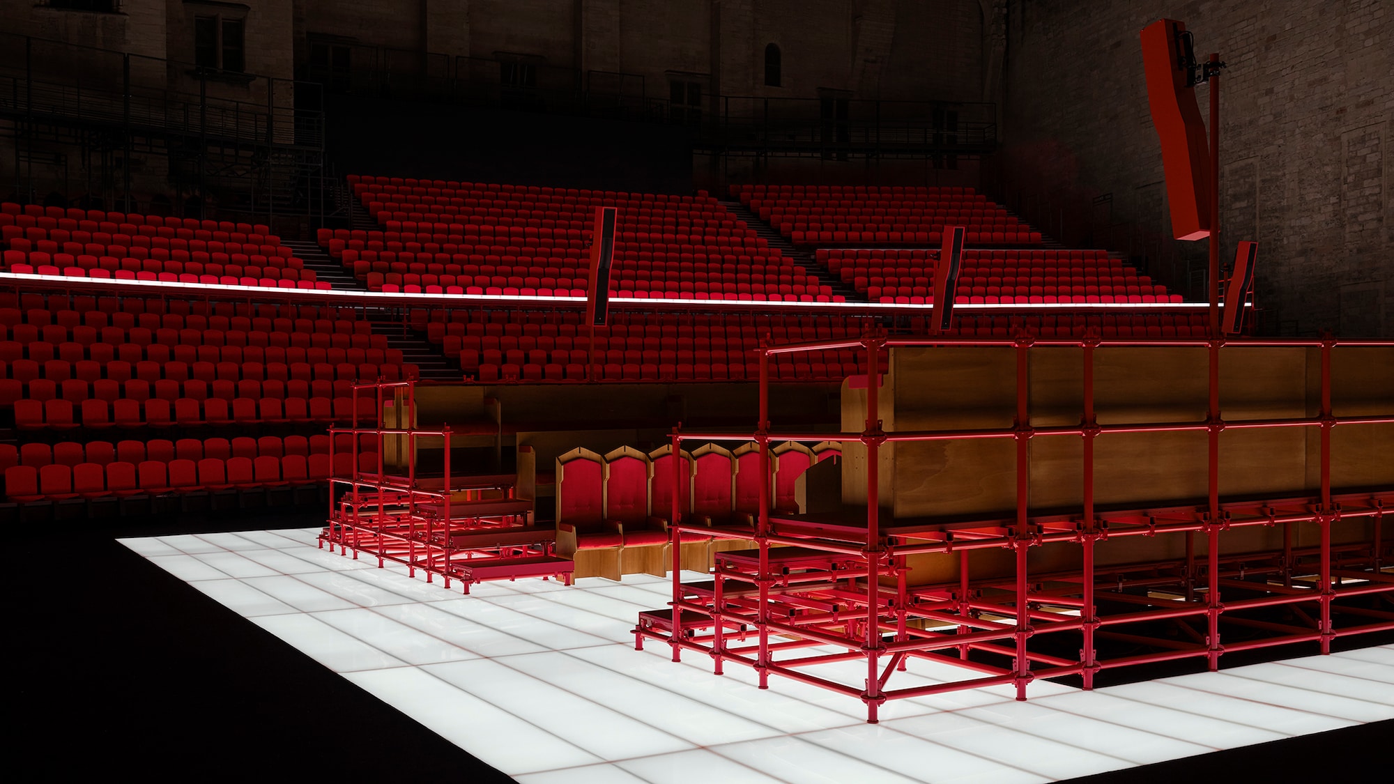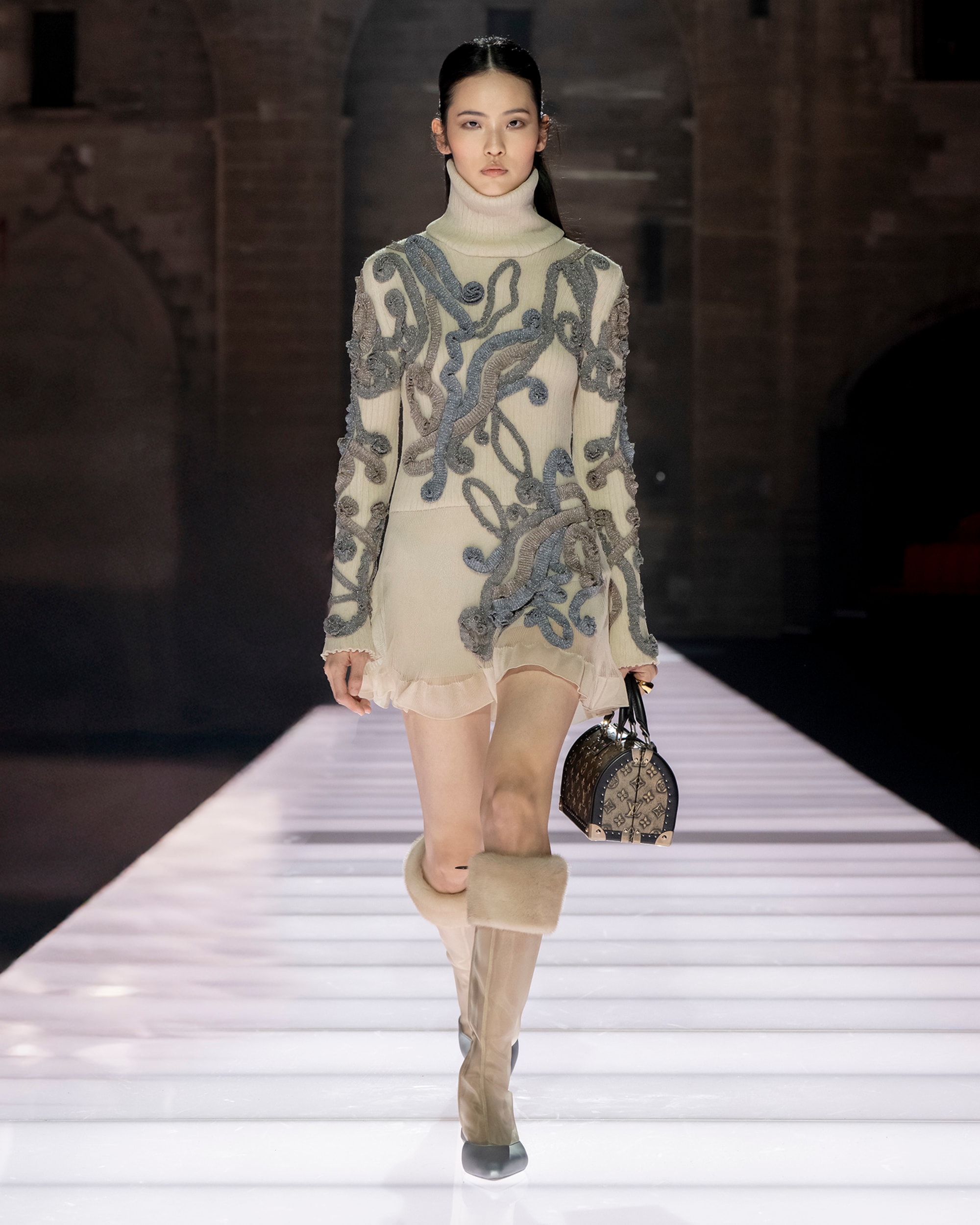 A theater of great history, the Palais des Papes in Avignon lends its medieval walls to Nicolas Ghesquière's reflection on the performative aspect of fashion and the emotional power it conveys.