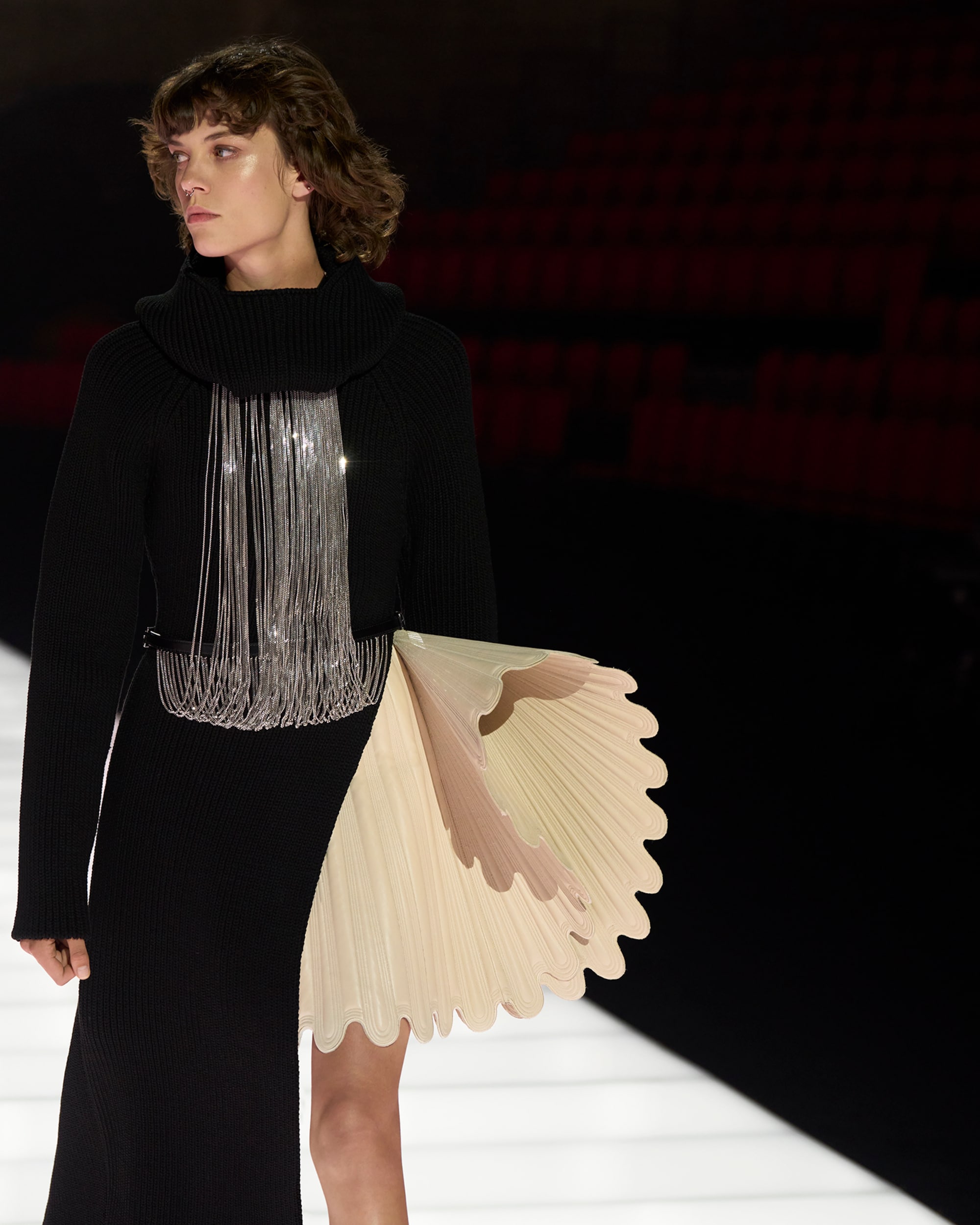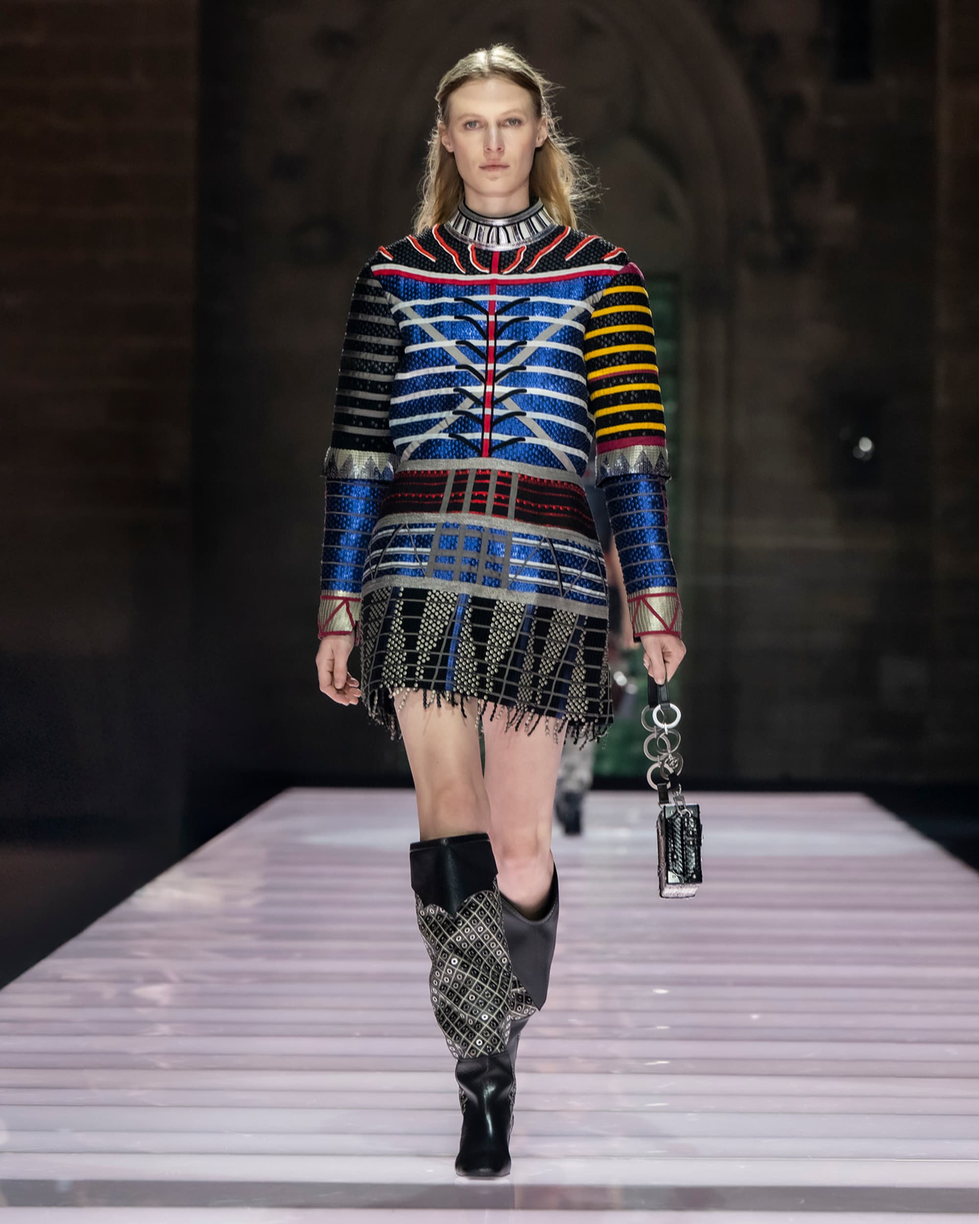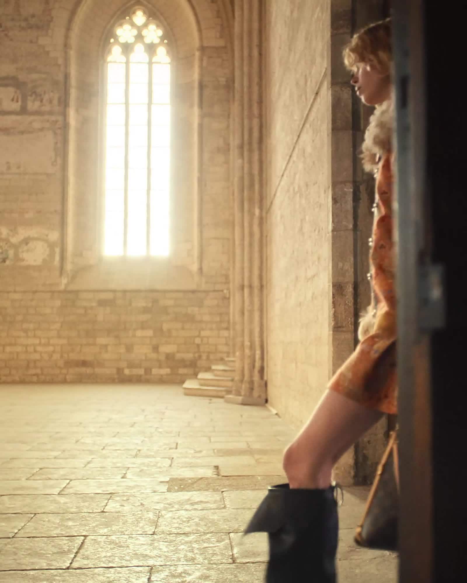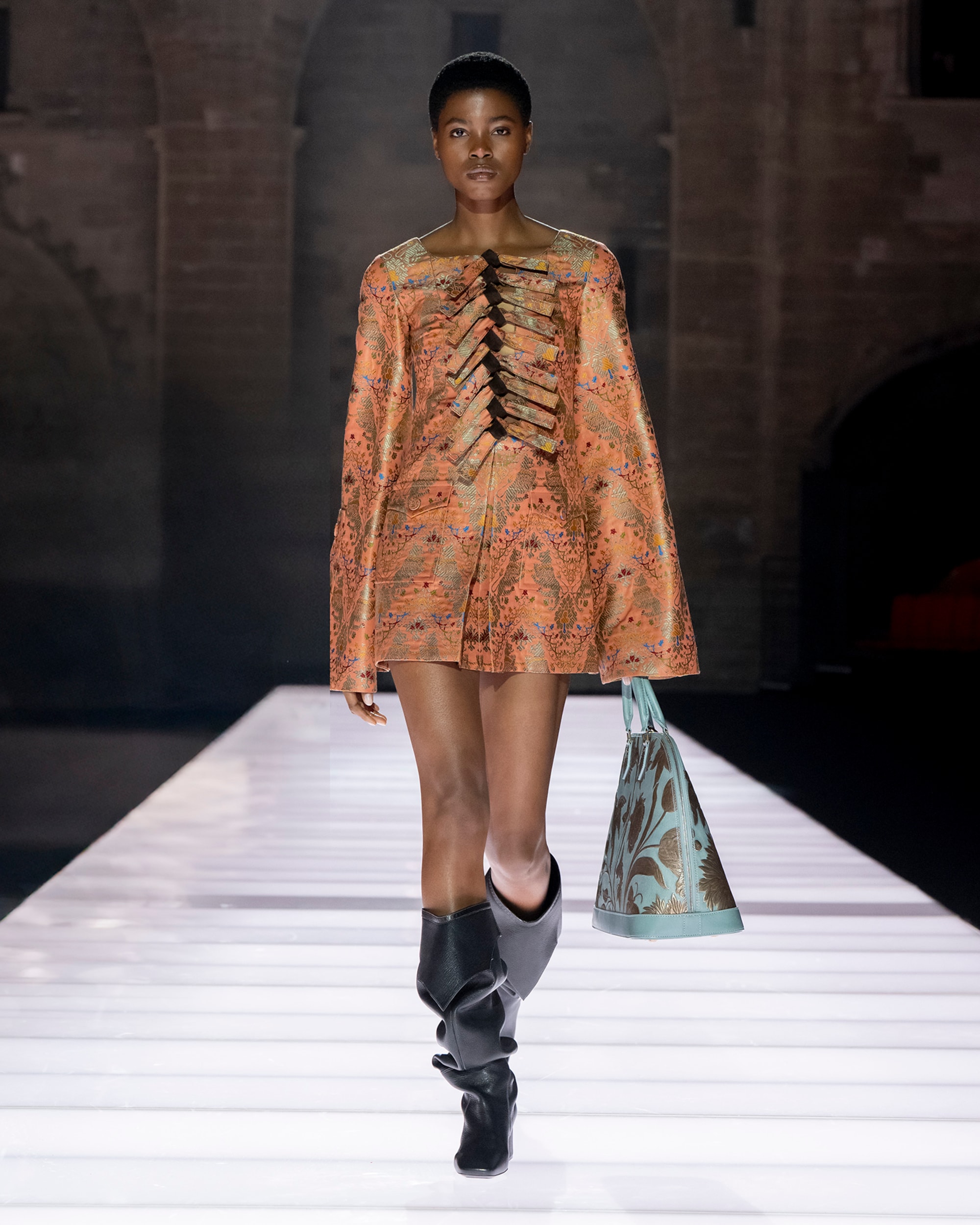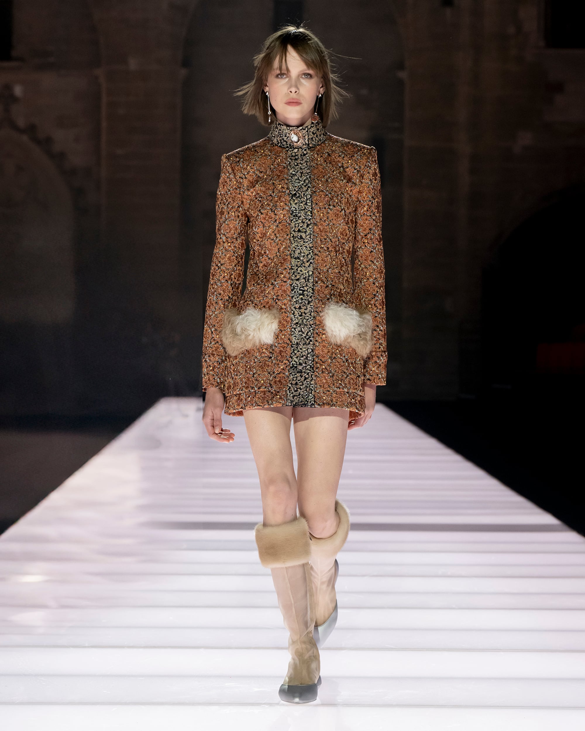 A theater of great history, the Palais des Papes in Avignon lends its medieval walls to Nicolas Ghesquière's reflection on the performative aspect of fashion and the emotional power it conveys.