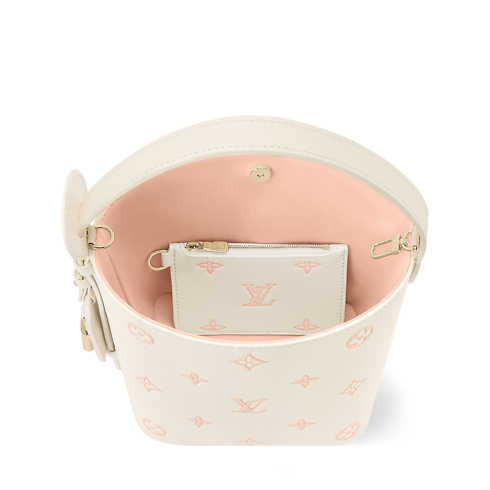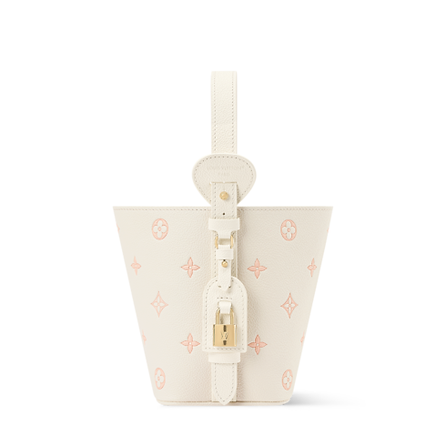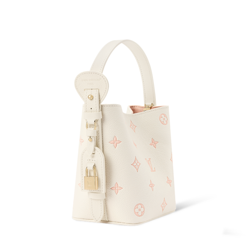 Defined by its playful Milky White and Peach color palette, this edition of the All In BB makes a subtle everyday statement. It is crafted from iconic Monogram Empreinte leather with light gold-toned hardware that lends a sleek finish. The decorative name tag and padlock are signatures of the House, paying tribute to archival Louis Vuitton luggage. It can be styled various ways and is sized to fit the essentials.