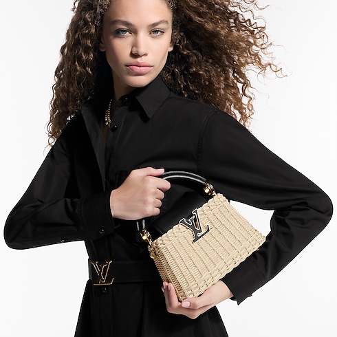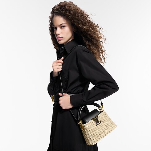 Inspired by the historic Louis Vuitton Picnic Trunk from 1892, this Capucines Mini is the perfect summer handbag. Each one-of-a-kind model is meticulously handwoven from rattan, taking two days to complete. It is trimmed with leather and adorned with the signature LV Initials in an elegant gold-toned finish. Wear it cross-body, over the shoulder or carried by hand.