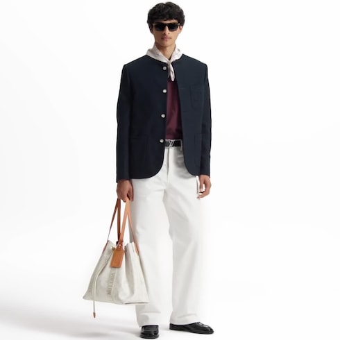 This single-breasted navy blue jacket makes an elegant addition to a summery wardrobe with its dandy collarless silhouette and lightweight open weave cotton. Inspired by this collection’s transatlantic cruise, it is adorned with a travel-inspired signature on the chest pocket and mother-of-pearl effect buttons in golden settings, while a woven Marque L.Vuitton Déposée label signs the back.
