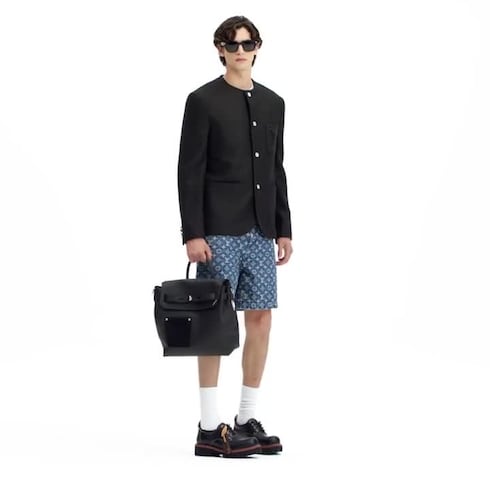 The collarless jacket—an icon of the House—is revisited here in timeless black boiled bouclette wool for a softly textured, warm and structured finish. A satiny embroidered LV adorns the chest pocket while large pearly buttons add a dandy twist. This chic silhouette can be dressed up or down, offering many styling possibilities.