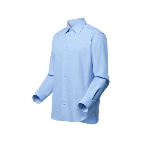 This pale blue long-sleeved shirt lends an elegant accent to a formal look. It is tailored from an organic cotton jacquard elevated with a softly textured LV Fishnet motif. The top button is signed with an LV, while a woven LV and Monogram Flowers label adorns the placket. Paired with the matching suit, it creates a sophisticated signature look.