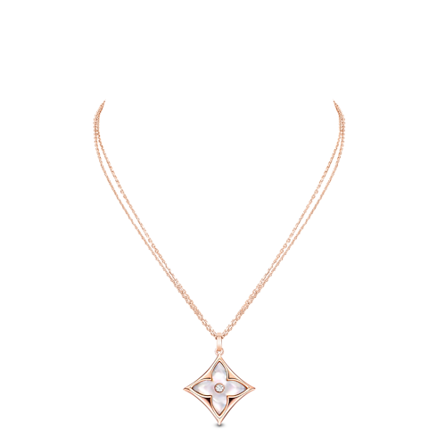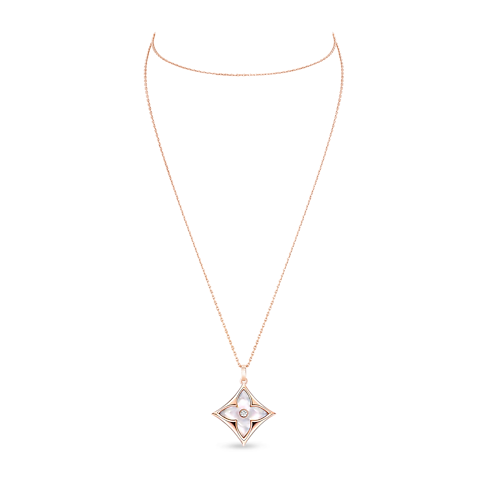 Color Blossom celebrates the Monogram Flower, created in 1896 by Georges-Louis Vuitton. Set into 18-karat pink gold, the pendant's petals are carved from white mother-of-pearl. Perfect for layering, the medallion can be worn at three different lengths. Its bold size complements other pieces from the Color Blossom Collection.