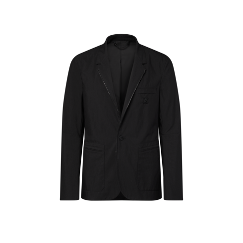 This black single-breasted jacket has an elegant silhouette twisted with utilitarian details. Crafted from technical cotton ripstop and unlined for summer ease, it has a zipper-edged lapel and black leather elbow patches. The breast pocket is adorned with an LV ornament, while a black leather Marque L.Vuitton Déposée patch signs the back. Pair with the matching cargo pants for an all black city look.