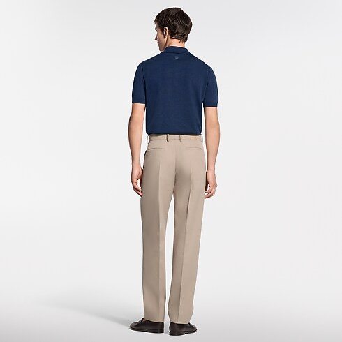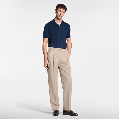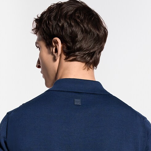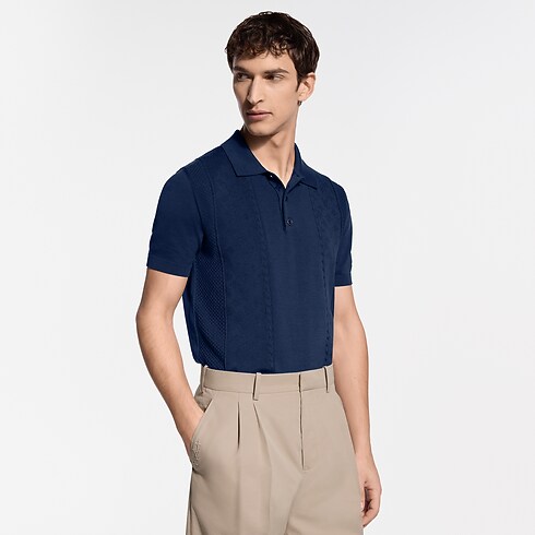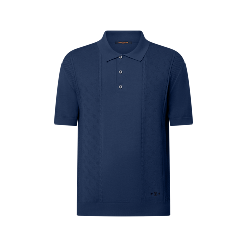 This dark blue short-sleeved polo shirt is knitted from fine cotton-silk yarn embellished with breezy pointelle work on the front, with decorative details including discreet Monogram and Damier signatures. Tonal signature embroidery adorns the bottom left hem, while a leather LV patch signs the back. Soft and breathable for warmer days, this comfortable layering piece brings a preppy accent to a formal look.