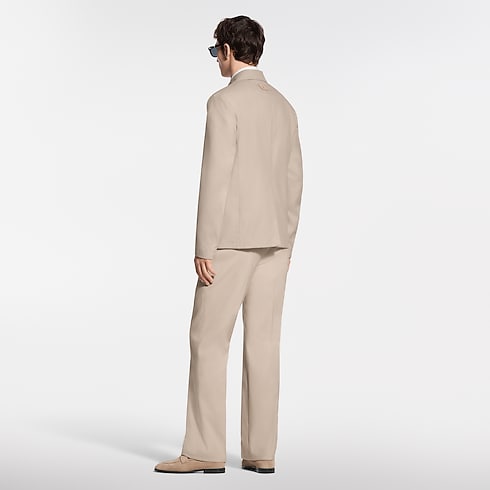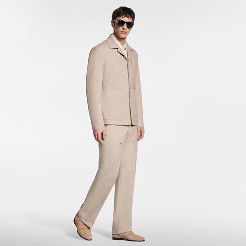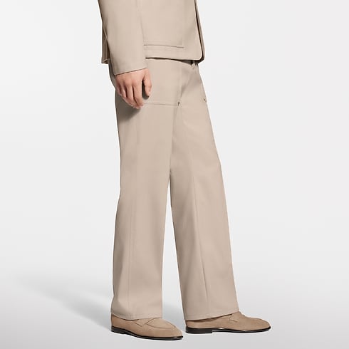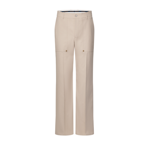 These elegant beige tailored pants have a workwear-inspired silhouette. Cut from a refined organic cotton-silk blend, they combine breathability with a soft luster. Two large patch pockets on the front are adorned with gold-toned Monogram Flower rivets, while a woven LV label signs the rear waistband. A matching jacket makes a modern set, perfect for spring.