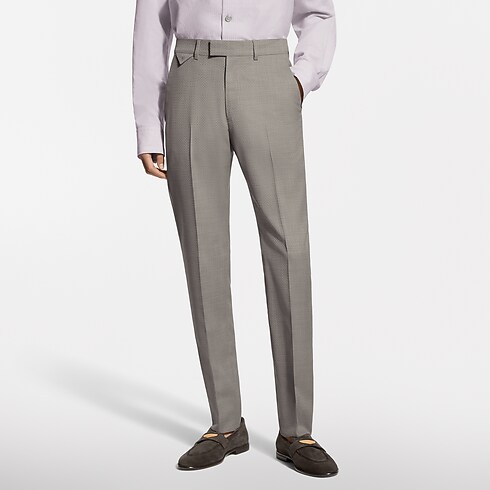 These pale beige cigarette pants are tailored from fine virgin wool featuring a delicate tone-on-tone jacquard Micro Flower Damier motif and signed with a woven LV label on the back. Their slender silhouette can be paired with a matching Napolitana jacket to create an elegant modern suit for business occasions, elegant summer evenings, or weddings.