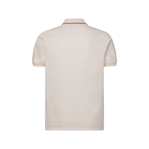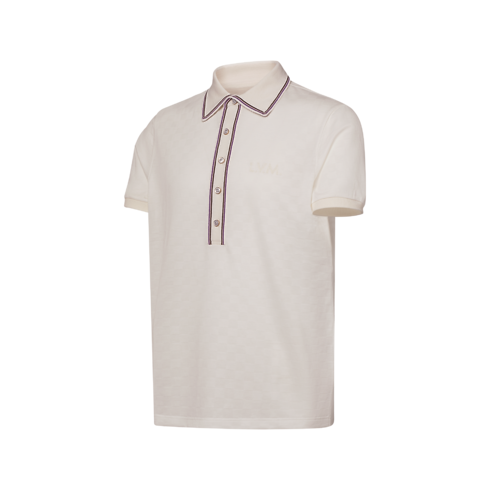 This refined polo shirt is crafted from cotton piqué in milky white with a textured allover Damier and tonal L.V.M. embroidery on the chest. Contrasting burgundy and brown stripes distinguish the knitted collar and five-button placket, while mother-of-pearl effect buttons in golden metal settings lend a Dandy finishing touch to this preppy style.