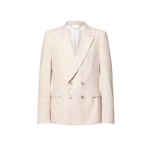 This chic double-breasted jacket draws on the refined textures and tonalities of the Spring-Summer 2026 show’s Indian inspiration. The sharp silhouette is tailored from pale beige wool-cotton with a subtle grained and flecked weave inspired by India’s naturally dyed yarns. A leather signature patch accents the left sleeve. Matching flared pants make a sharp suit for spring.