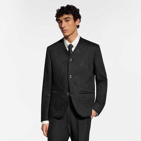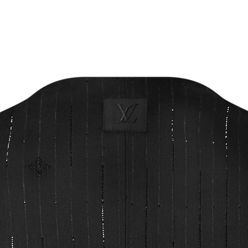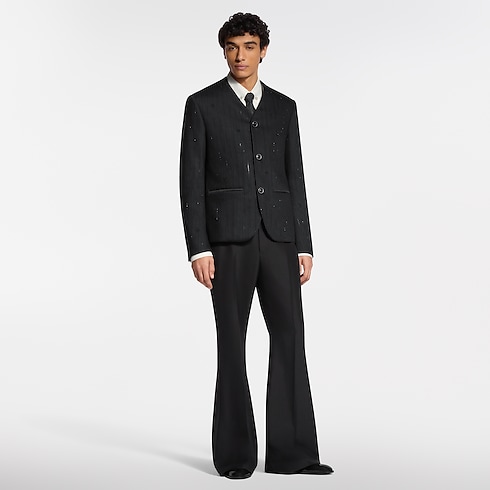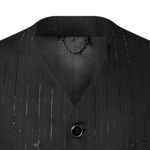 This distinctive black evening jacket draws on the iconic collarless style introduced by Pharrell Williams. The minimalist silhouette, featuring a V-neck opening and piped satin pockets, is adorned with glittering rhinestone pinstripes incorporating Monogram elements. LV cuff links and signature buttons add jewel-like accents. This richly detailed piece brings a sophisticated finishing touch to an evening look.