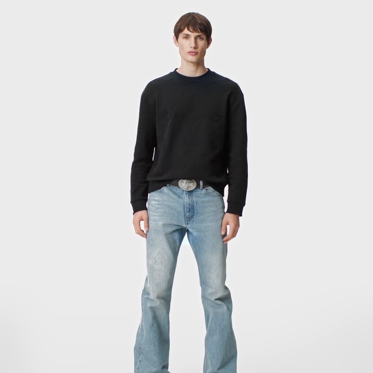 This timeless black cotton jersey crewneck is adorned with the FW24 Show’s LV Arabesque motif, inspired by ornate vintage cowboy boots. The graphic motif incorporating Monogram elements is embroidered all over in tonal thread for a contemporary look. An LV signature adorns the chest of this casual yet sophisticated piece.