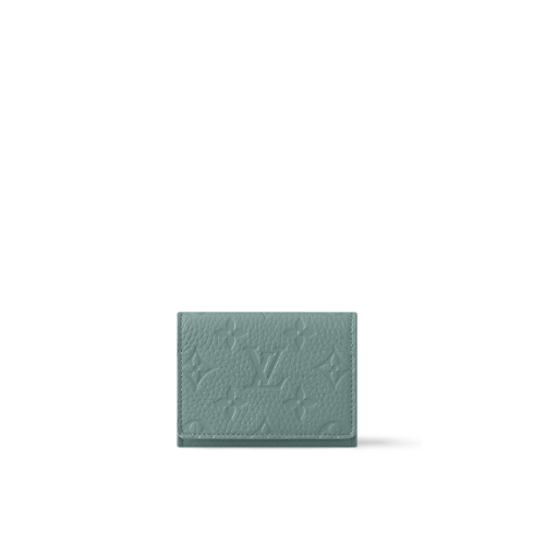 The Envelope Business Card Holder is crafted from Monogram coated canvas and Taiga cowhide leather. It snaps open to reveal an interior lined in blue cowhide, featuring a card slot and a gusseted compartment for cards and other small belongings. The colorway and combination of canvas and leather give this accessory a playful feel.