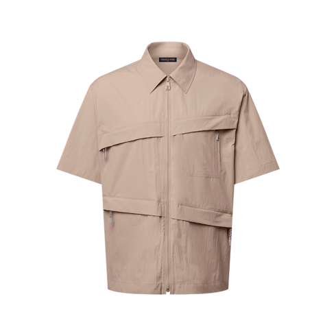This short-sleeved zip-up shirt draws on the Spring-Summer 2026 show’s chic mountaineering theme in a light technical fabric and timeless camel hue. Four asymmetrically placed zippered pockets with sporty pullers add a contemporary touch, while tone-on-tone signature embroidery accents the breast pocket. This piece can be styled like a regular shirt or worn open over a T-shirt.