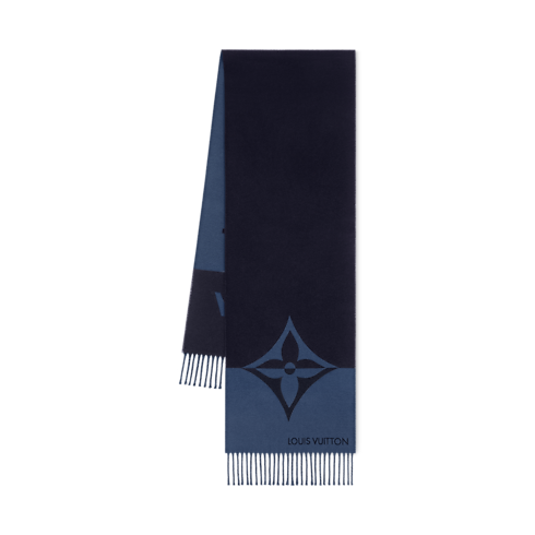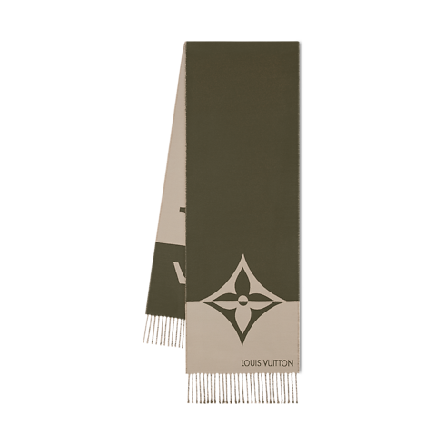 The Graphic Dual Scarf is a narrow, two-toned style with unusually eye-catching details. At one end, an oversized pair of LV Initials is split horizontally in a rich olive and creme. A single Monogram Flower at the other end is given the same striking color treatment. A fringed finishing offers a classic touch.