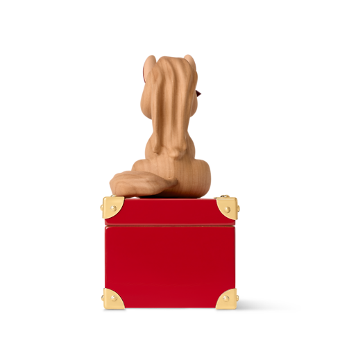 The collectible horse box is an emblem of endurance, passion, velocity for the Chinese New Year. Donning a Monogram Flower eye and leather ears, the wooden creature playfully sits atop the red lacquer container, with gold-toned metal corners that honor the House's trunk craftsmanship. A matching LV Circle emblem adds to the depth and richness of the style.