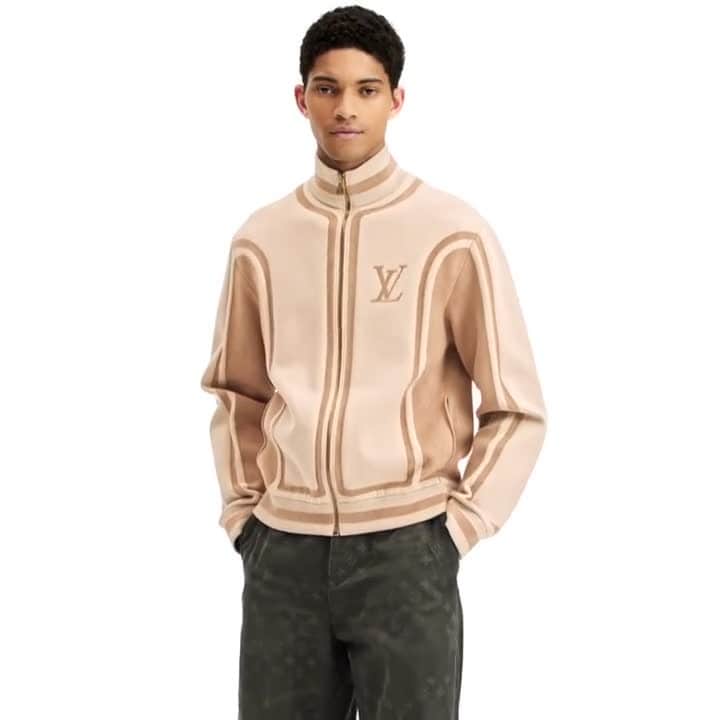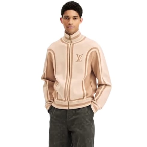 Casual yet elegant, this zip-up knitted tracksuit top is ideal for relaxing in style. The two-tone pattern features sporty intarsia bands on the sleeves and body which are echoed on the ribbed collar, cuffs and hem. An intarsia LV distinguishes the chest, while an elegant Vuitton signature adorns the back. The different tones are expressed with different stitches creating a subtle 3D effect.