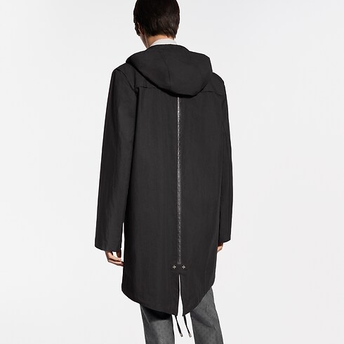This water-repellent black hooded parka is an elegant and functional light outer layer crafted from technical cotton ripstop. Sophisticated details elevate the minimalist silhouette, with an LV snap button at the top of the zipper placket, Monogram Flower eyelets and rivets and leather LV Lozine embossed tape on the back in homage to the House’s travel heritage. A versatile piece for business or weekend looks.