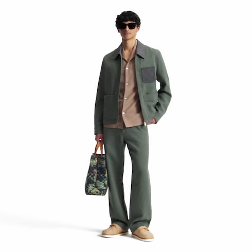 These summery dark green pants, crafted from light linen canvas, feature a minimalist silhouette, enhanced by a nubuck Damier jacqueron at the back. A versatile option for everyday looks, these pants can also be styled as a contemporary set with a matching workwear jacket.