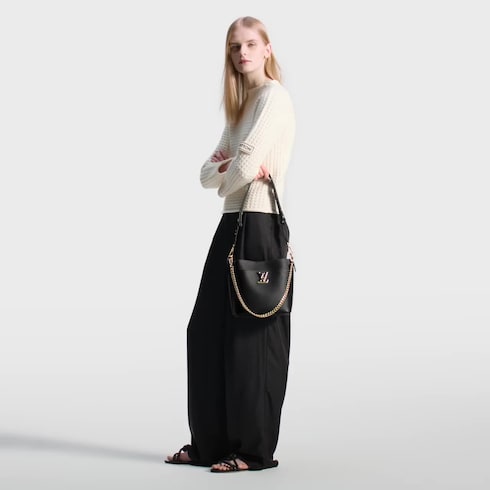 The Lock and Walk is a sleek bucket bag fashioned from grained calf leather. Lightweight and comfortable to carry, the bag combines casual ease with Parisian chic. A large front compartment secured with the LV turn lock provides convenient access to essential belongings. The detachable smart strap and golden chain handle provide for different carry styles.