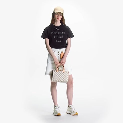 This playful piece twists a basic T-shirt shape with a reversed Louis Vuitton signature. The motif is printed on the cotton jersey fabric with a distinctive mottled effect. The House’s iconic chain detail adds a finishing touch to the piece.