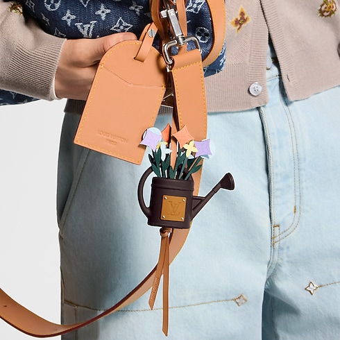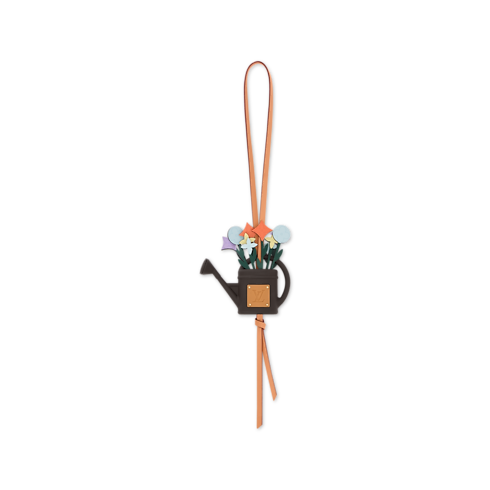 The LV Flowers watering can captures the romance and renewal of a new season. A bursting arrangement of colorful flowers, reinterpresting the iconic flowers from the House's monogram are coming from a brown watering can, highlighting the House initials. This bag charm can be worn in a bag or directly on a pants.