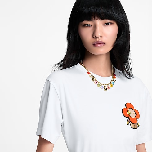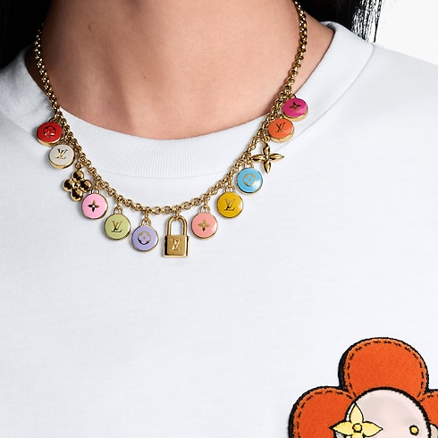 The bold, playful design of the LV Confetti necklace is a rainbow celebration of the House’s beloved symbols. Suspended from a delicate gold-toned chain, colorful disks adorned with the iconic Monogram motifs are interspersed with Monogram Flowers and an LV padlock. This elegant, eye-catching necklace adds a burst of vibrant color to any look.