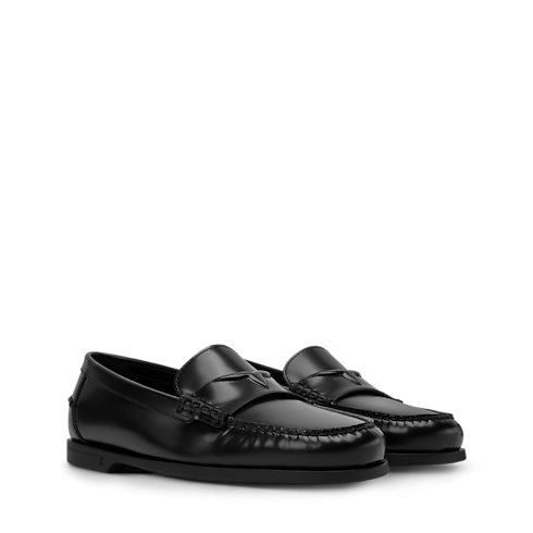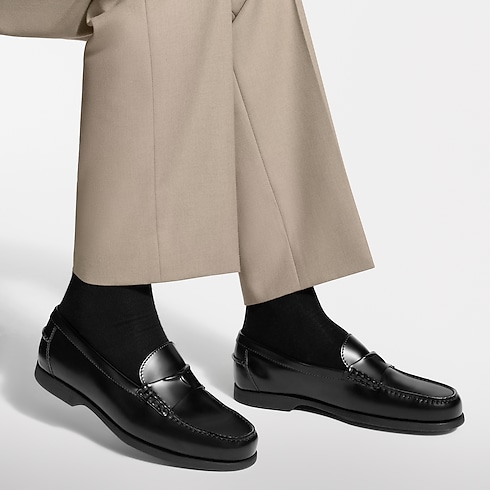 The LV Croisette loafer balances elegance and comfort with its beautifully crafted upper in waxed calf leather and its supple rubber outsole, designed for ease and lightness. Revisiting the classic preppy loafer, the upper is embellished with a tone-on-tone debossed Monogram Flower on the strap, while the heel is discreetly signed with the LV Initials.