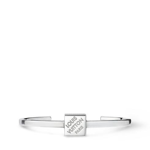 The sterling silver LV Cube rigid bracelet was inspired by a puzzle game called Pateki designed by Gaston Vuitton in 1932. Its centerpiece is a finely crafted cube engraved with stripes and a Louis Vuitton Paris signature, echoing the look of the House’s emblematic Damier canvas. An original bracelet with a distinctive aura of playful elegance.