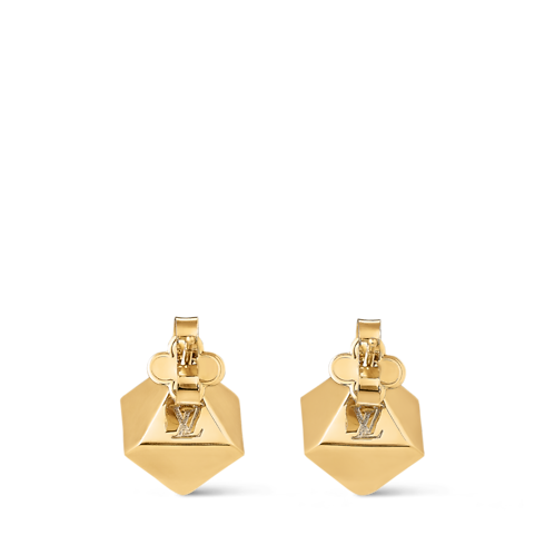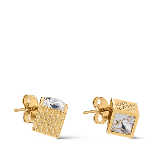 The unique design of the LV Cube earrings was inspired by the playful spirit of Pateki, a puzzle game invented by Gaston Vuitton in 1932. Cubes of gleaming gold-colored metal are adorned with sparkling rhinestones and engraving reminiscent of the heritage Damier canvas. A Louis Vuitton Paris signature adds a final House touch to these fun, eye-catching earrings.