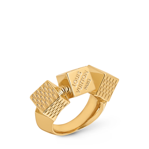 The angular forms of Pateki, a puzzle game devised by Gaston Vuitton in 1932, are brought to life in the playfully elegant LV Cube ring. Three gold-colored metal cubes are delicately engraved with stripes recalling the look of the iconic Damier canvas. The Louis Vuitton Paris signature adds a finishing House touch to this finely crafted, enchanting ring.