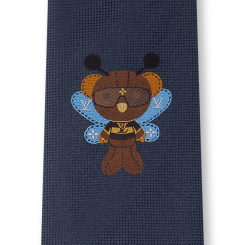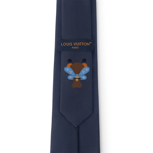 The LV Louis Bear Bee tie is a navy silk style with a singular, playful addition. Once simply a cozy bedtime companion, the House figure returns with blue wings, embellished with the Monogram in white, antennae, and striped attire. This is a personality-filled accessory for a true enthusiast of the House.