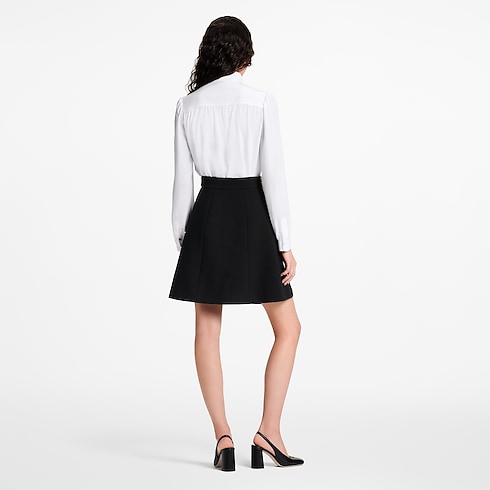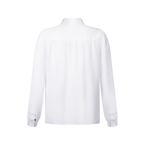 The House’s go-to long-sleeved blouse gets a minimal makeover in the LV Night capsule’s sharp palette. Crafted from fluid double-silk georgette that emphasizes the feminine cut of the sleeves, with golden hardware adding a refined metallic accent. The removable lavaliere collar is embellished with Monogram Flower details for a chic, contemporary signature.