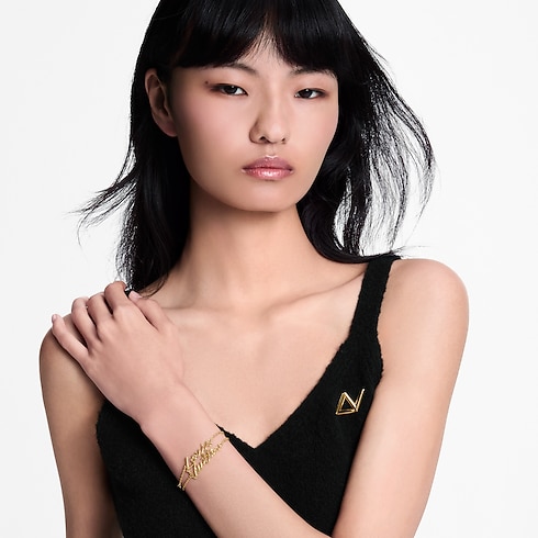 Crafted in lustrous gold-toned metal, the LV Script bracelet features a new Louis Vuitton signature showcased as the backdrop of the Spring-Summer 2025 fashion show. Its distinctive design comprises a double row of fine chain links framing the House’s name in sleek, flowing script. Worn alone or stacked, it adds a charming touch of glamour to any outfit.