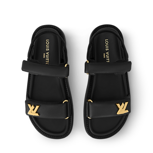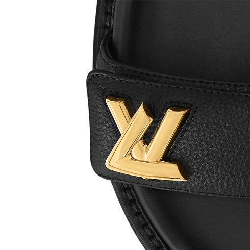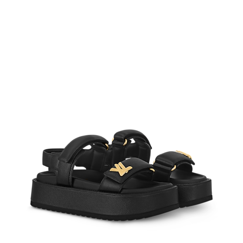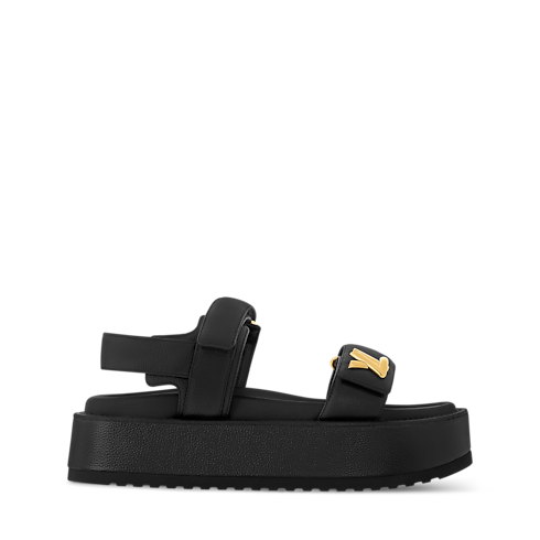 The LV Sunset platform comfort sandal in grained calf leather brings an on-trend platform style to the LV Sunset line. This model retains the line's two lightly padded straps, which are adjusted with velcro, as well as its comfortable anatomic footbed, while adding a leather-covered platform. The front strap is signed with an LV Twist accessory.