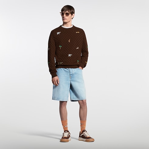 This long-sleeved cotton crewneck features a tone-on-tone textured Damier knit in a rich brown color. It is embellished with the Spring-Summer 2026 show’s iconic LV x The Darjeeling Limited motif, which celebrates the art of travel with vibrant embroidered depictions of various animals. A leather signature patch on the back completes this graphic piece.