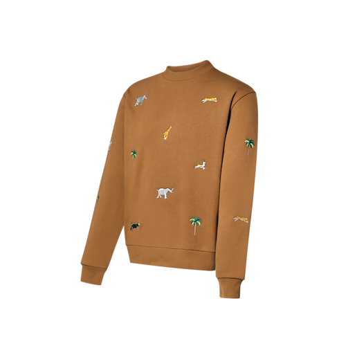 This casual crewneck, crafted in soft organic cotton, is embellished all over with the Spring-Summer 2026 show’s iconic LV x The Darjeeling Limited motif. Manifest in meticulous embroidery, it features vibrant depictions of palm trees and animals against a warm caramel-colored base. An ode to the art of travel, it brings a graphic accent to everyday looks.