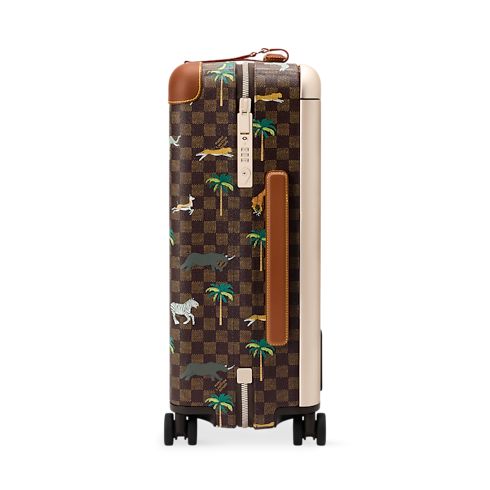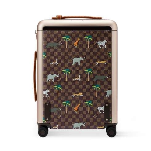 The Horizon 55 rolling suitcase is made from Damier Ebene Heritage canvas, featuring illustrations of wild animals from the savannah as part of the LV x The Darjeeling Limited collection. Brown leather trim on the reinforced corners and cane handle accentuates the darker palette. Its cabin-size format offers an unexpectedly spacious interior.