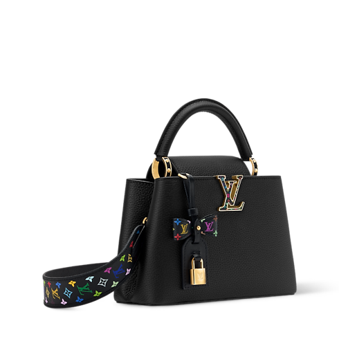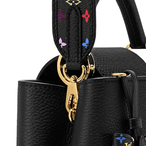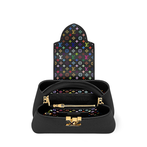 This elegant Capucines BB is updated for the House's exclusive anniversary collection, celebrating 130 years of the Louis Vuitton Monogram. Designed in collaboration with Takashi Murakami, this sleek edition is offered in Black Taurillon leather accented with multicolor Monogram trims, including a bow-shaped keybell. The signature gold-toned padlock lends a sophisticated finish.