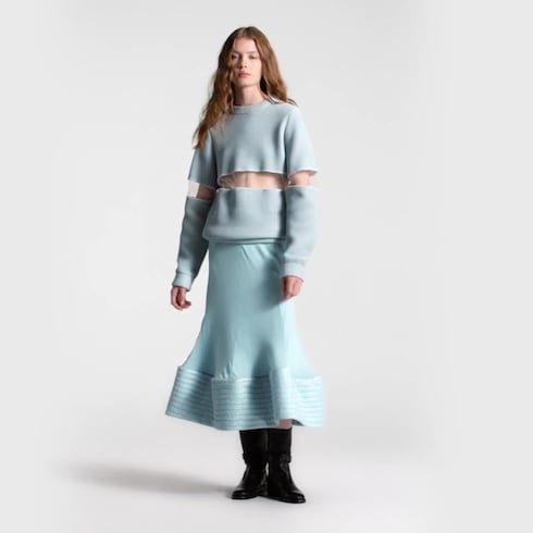 This statement midi skirt is a playful nod to the runway’s fantastical mermaid looks. Crafted from lined silk georgette, the silhouette gracefully skims the figure around the hips, while the exaggerated jacquard hemline is topstitched for a structured, sculptural finish. Fastened at the back with an exposed half-zipper.