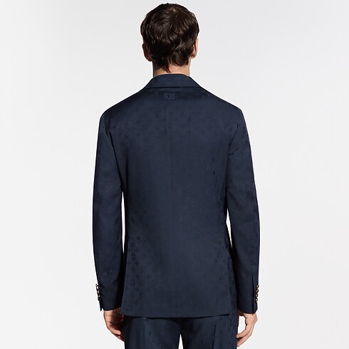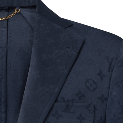 This softly tailored single-breasted Napolitana jacket is light, comfortable and elegant. The timeless navy blue wool fabric is elevated with a tone-on-tone jacquard Monogram motif offering a subtle play of matte and lustrous accents. Matching drawstring pants make a refined set that can be dressed up or down, with a matching shirt or a light knit for an effortless look.