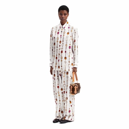 A bold allover print of the collection’s precious gemstone necklace motif uplifts this timeless shirt with an elegant array of signatures and seasonal hues. It is tailored from fluid silk twill in a versatile straight shape complete with a smart collar and fastened cuffs. Contrasting buttons complete the look with a graphic accent.