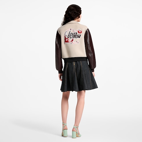 Revisiting a timeless varsity look, this jacket is elevated in a plush double-face wool-silk blend with contrasting sleeves in lambskin leather for a refined finish. The chest and back are embellished with seasonal Louis Vuitton patches that nod to the House’s Art Nouveau heritage, while gold-toned snap buttons and a graphic ribbed waistband underscore the sporty style.