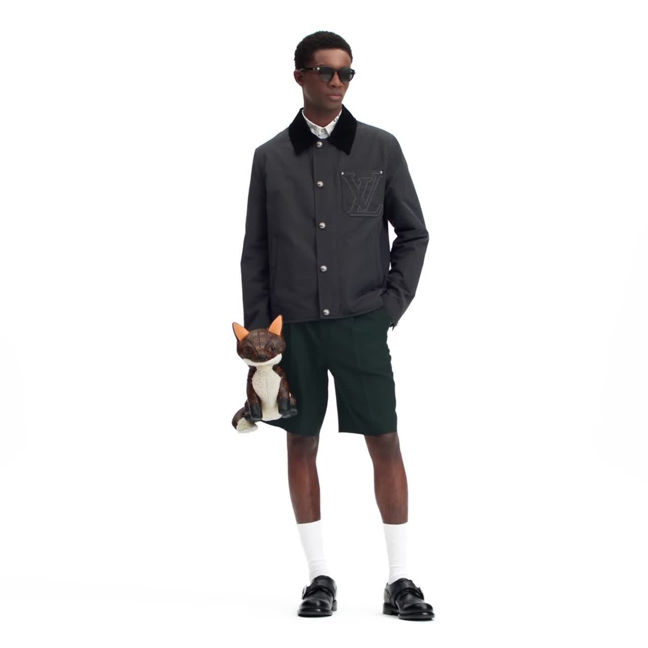 This black workwear jacket with a smart corduroy collar is a timeless piece for all seasons, featuring a water-repellent nylon body and quilted lining. The minimalist silhouette is accented with an embroidered LV on the chest pocket and a leather Marque L.Vuitton Déposée patch on the back. A snap button placket over the zipper accentuates this item’s functional elegance.