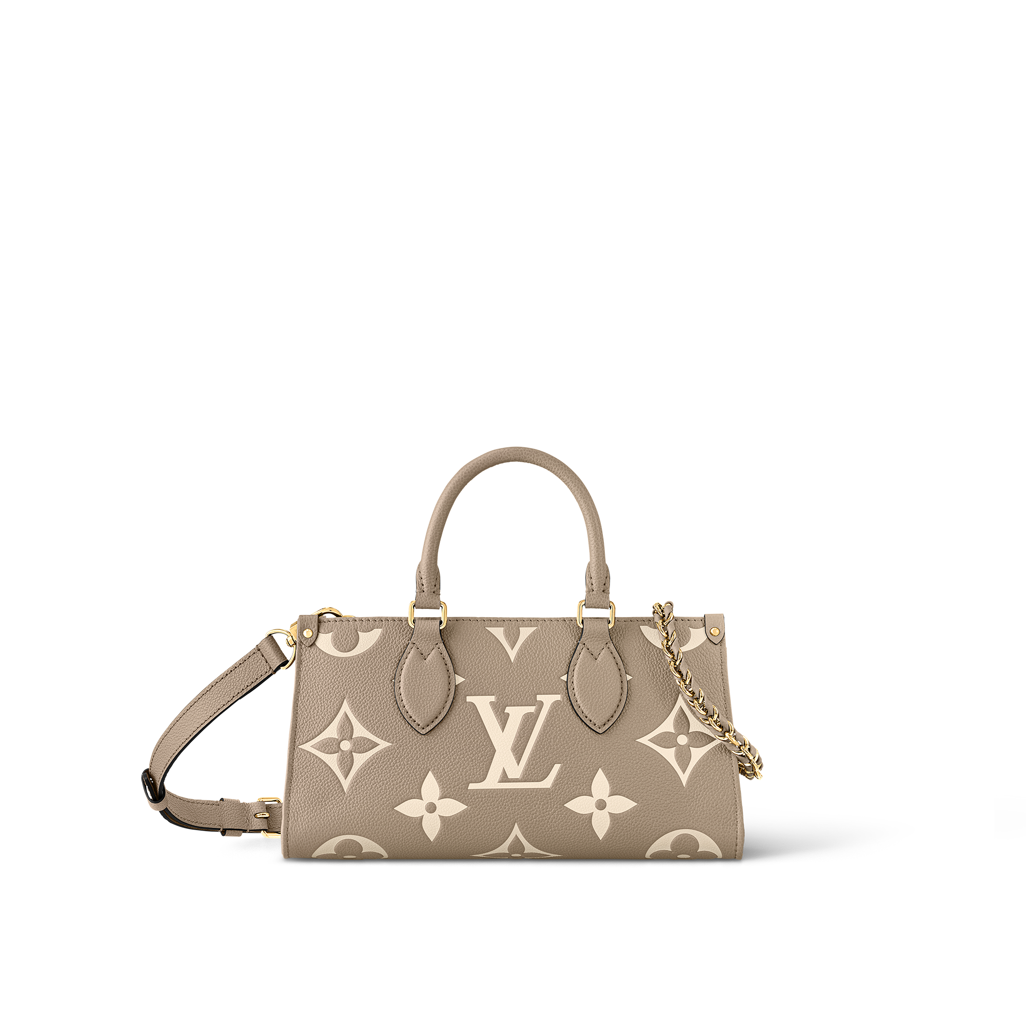 Introducing the OnTheGo East West tote, interpreted in a beautifully proportioned east-west silhouette. Made from Monogram Empreinte leather embossed with a tonal Giant Monogram motif, this compact model boasts a well-organized interior for daily essentials. The bag lends itself to a variety of carry styles, thanks to its two articulated top handles and a removable chain-and-leather strap.