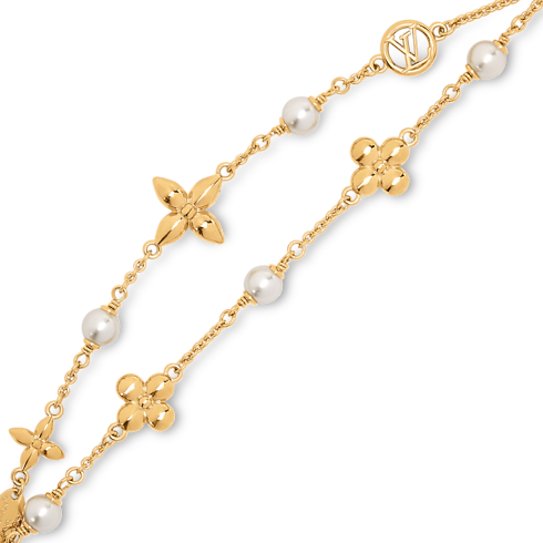 Inspired by the magic of a starry night sky, the Pearl Constellations bracelet emanates subtle opulence with a touch of celestial charm. A constellation-like array of Monogram Flowers in bright gold-toned metal is interspersed with radiant white resin pearls. An LV Circle emblem adds an extra signature accent to this delicate, ultra-feminine bracelet.