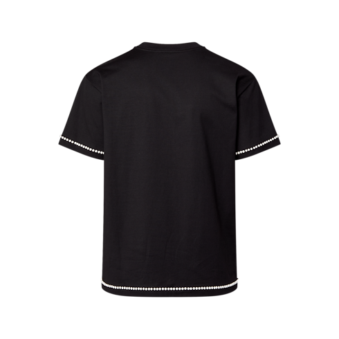 This black cotton t-shirt is embellished with pearly studs around the sleeves and bottom hem, bringing a sophisticated dandy twist to a classic silhouette. A tonal ‘L.Vuitton Marque déposée’ embroidered on the chest with a relief effect in lustrous yarn adds a refined signature to this casual yet elegant piece.