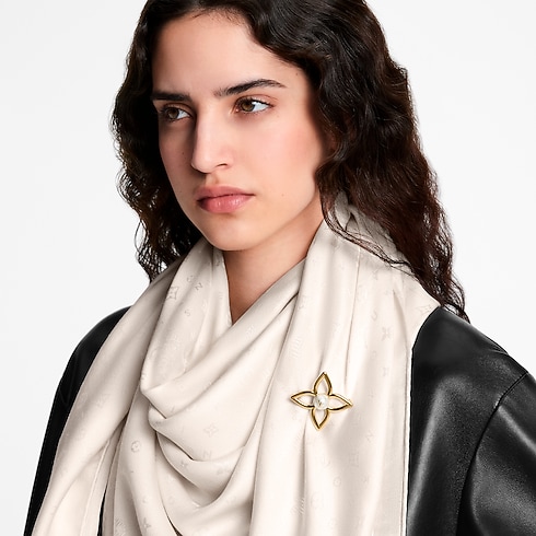 Inspired by the classic Monogram motifs and the timeless beauty of the pearl, the Pearly Flower brooch emanates feminine refinement. Its understated design features an openwork Monogram Flower in radiant gold-toned metal encircling a white resin pearl accented with the LV Initials. An exquisite jewel, and a sophisticated expression of the House’s signature style.